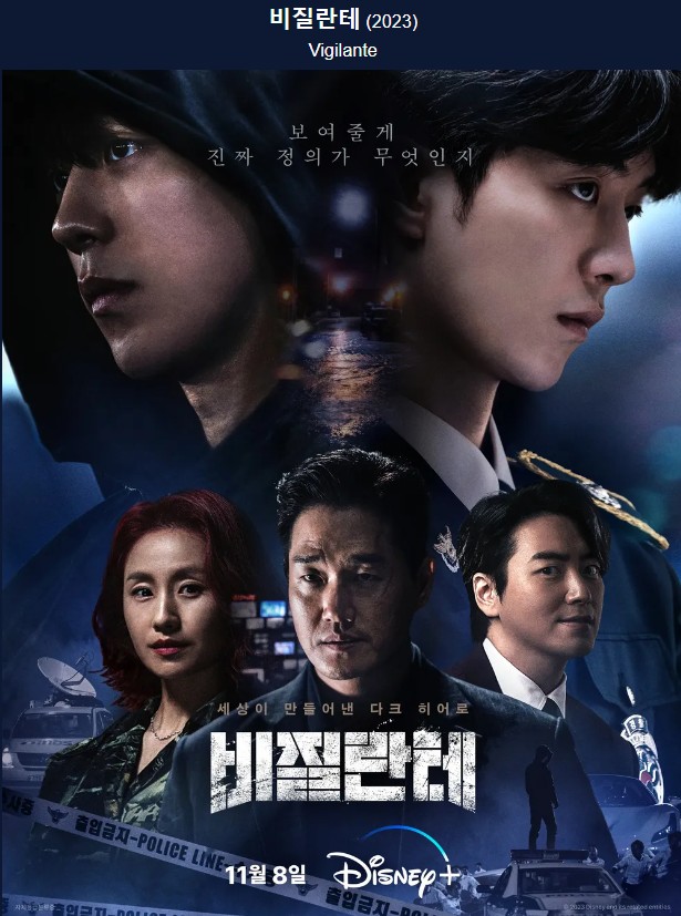 낮에는 법을 수호하는 모범 경찰대생, 그리고 밤이면 법망을 피한 범죄자들을 직접 심판하는 '비질란테'로 살아가는 김지용(남주혁)과 그를 둘러싸고 각기 다른 목적을 가진 사람들의 이야기를 그린 액션 스릴러입니다.