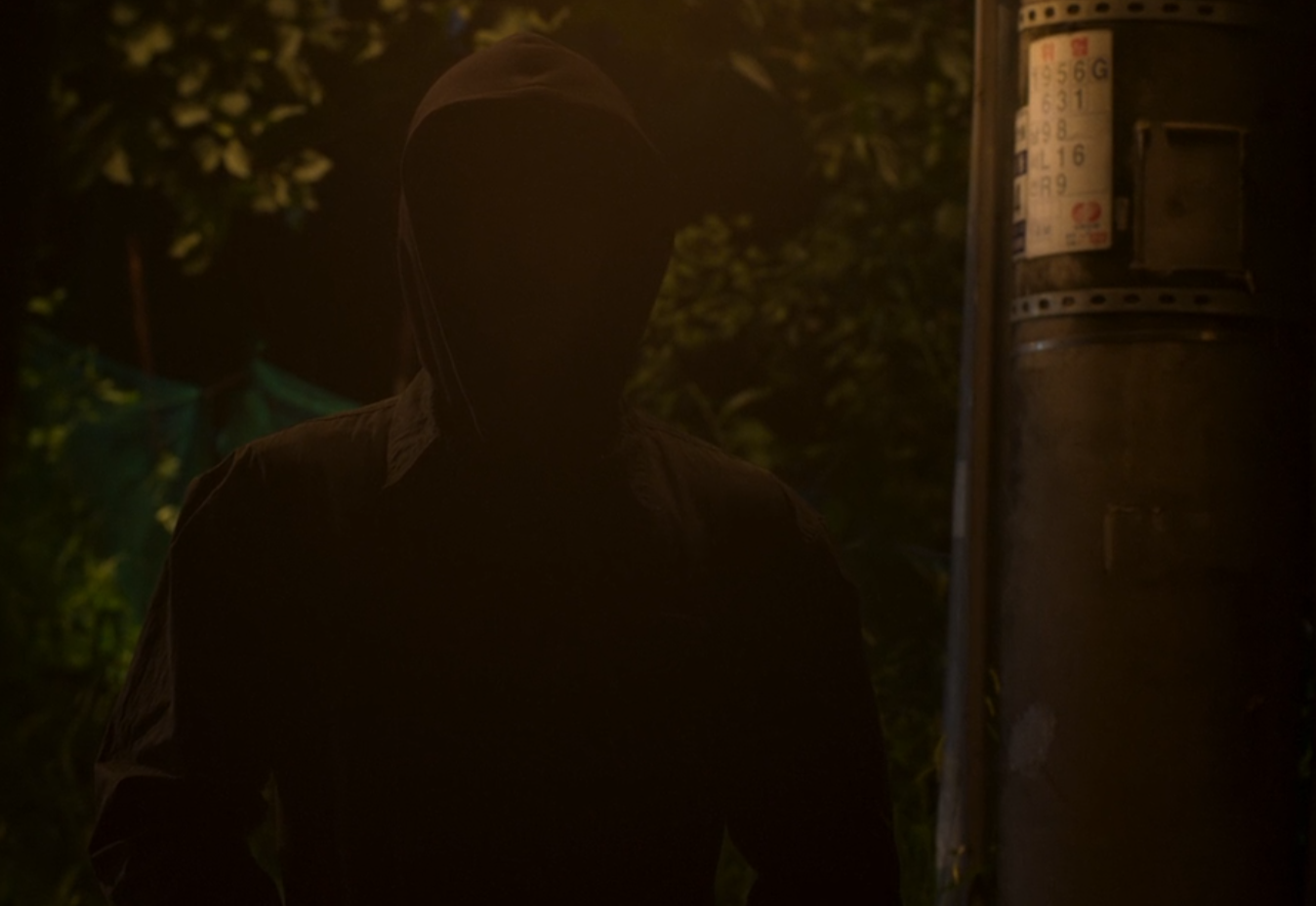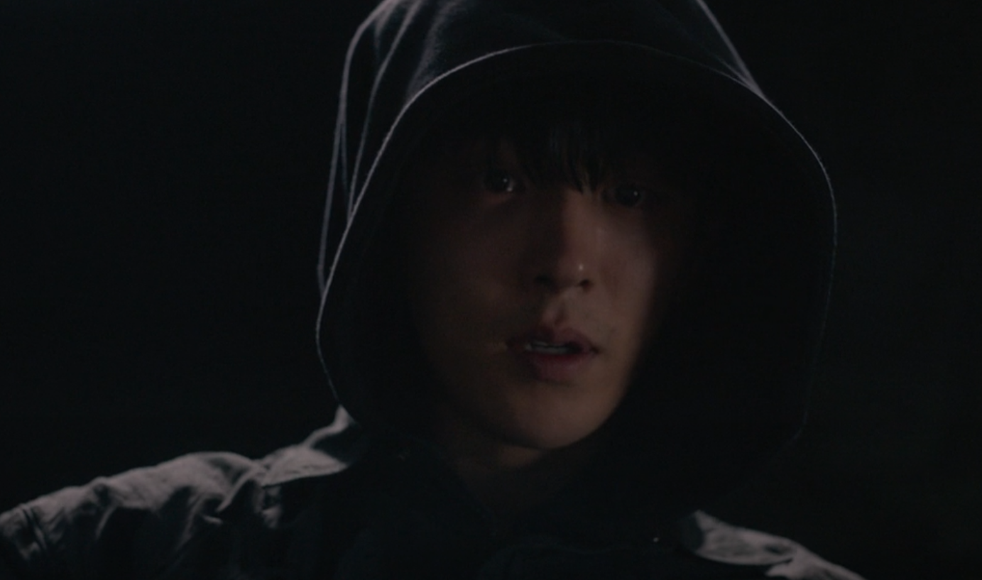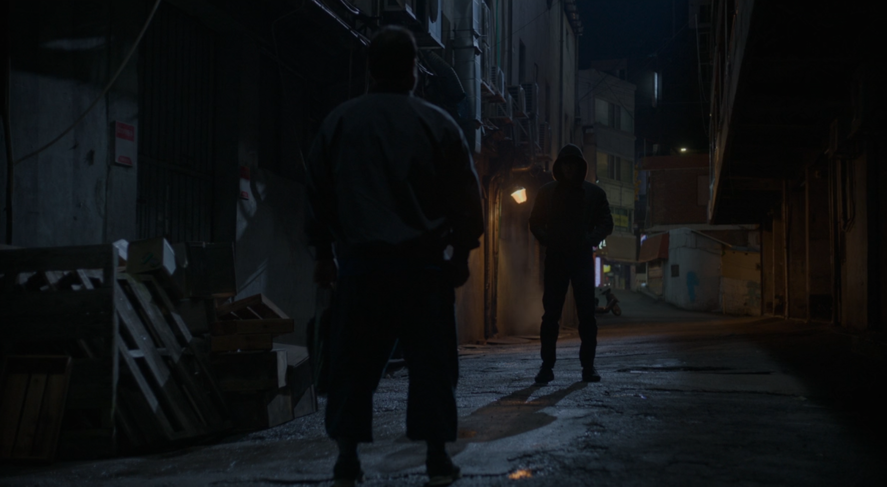 그리고 악당의 뒤를 밟기 시작합니다. 그렇게 한참을 으슥한 골목까지 들어섰음에도 계속 따라가는 '검은색 후드'의 남자, 악당은 뒤에서 계속 따라오는 인기척을 느끼며 뒤를 돌아보게 되는데, 그렇게 후드를 쓴 남자가 따라오는 이유가 자신이 목적임을 눈치채고, 말을 걸어봅니다.